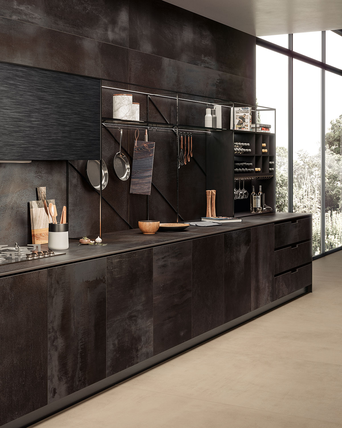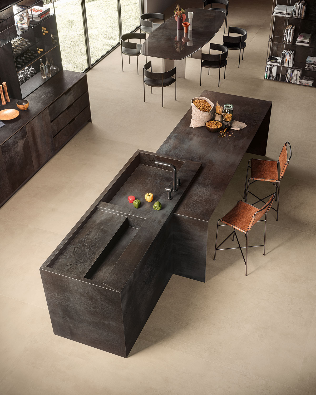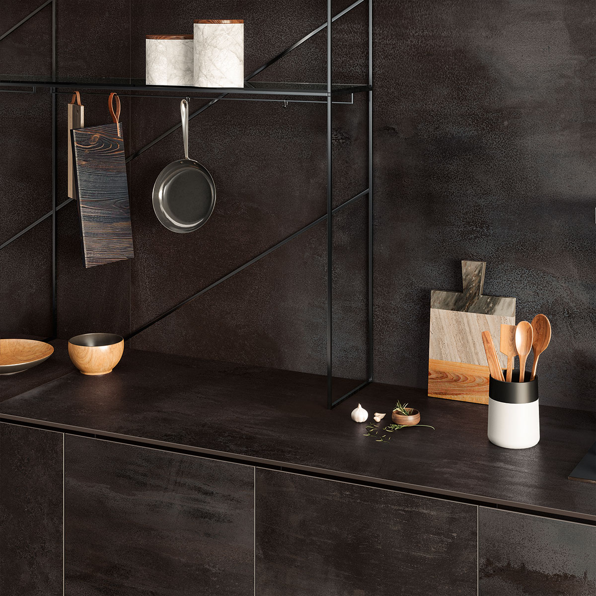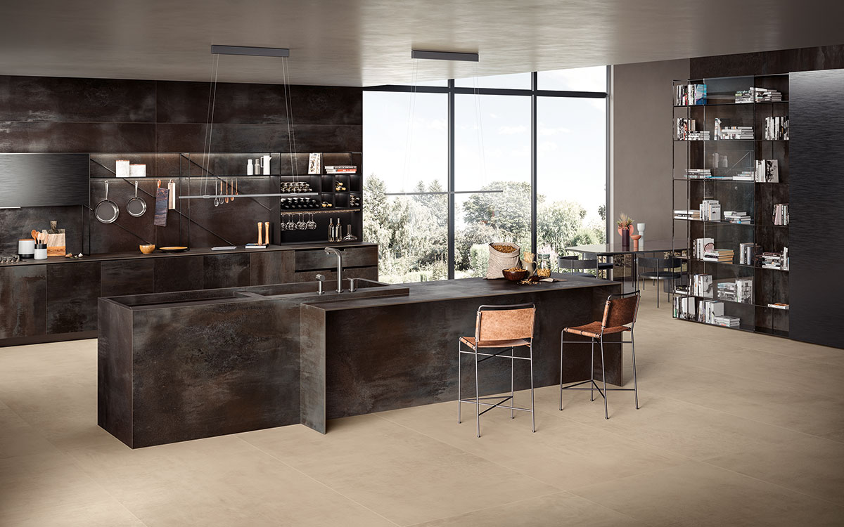 Blaze Iron metal görünümlü porselen seramik plakalar, mutfak tezgahları, adalar, masalar, kapılar, sıçratma koruyucuları ve duvar kaplamaları için idealdir. İşçiliğinin görsel gücü modern ve atmosferik ortamlar oluşturur.