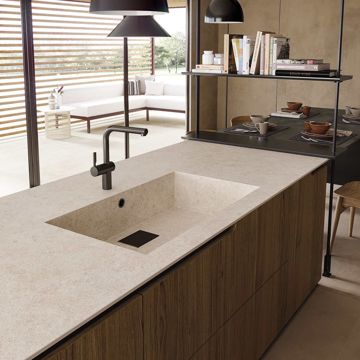 Minimalist karaktere ve taş görünümüne sahip olan Boost Stone Ivory stoneware plakalarının dokusu, bu yüzeylere çok yönlülük kazandırır: modern konut ortamlarında mutfak tezgahları, tezgah araları, kapılar, masalar gibi veya restoran ve bar tezgahları gibi iş ortamlarında uygulanabilir.