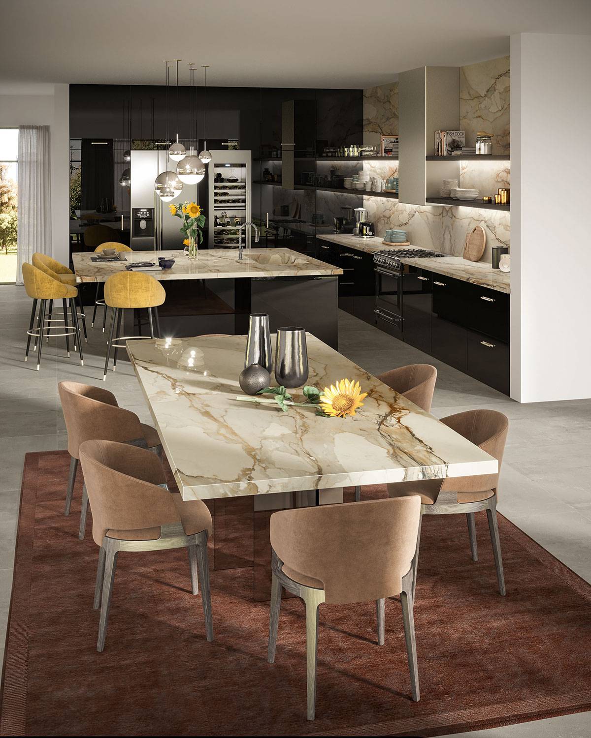 Calacatta Antique levhalar, mutfak tezgahları, arka paneller ve iş tezgahı için kaplama olarak kullanılabilir, ortamlara zarif bir atmosfer kazandırır.
