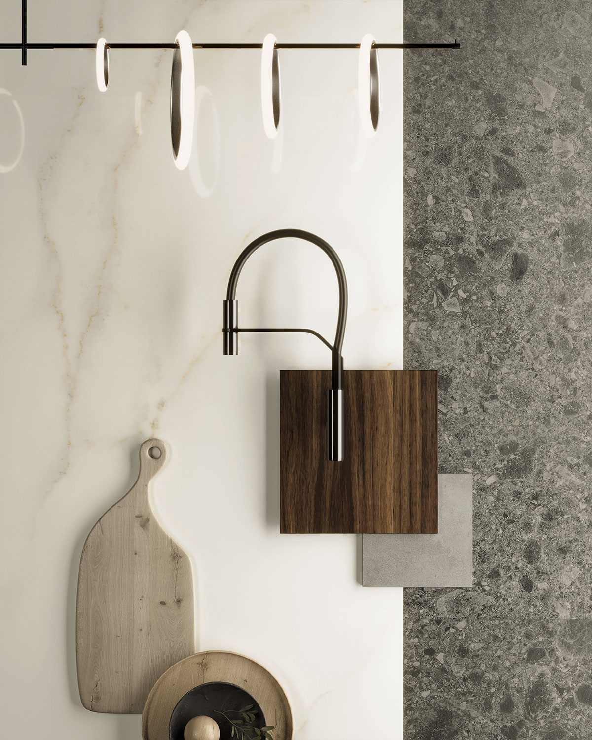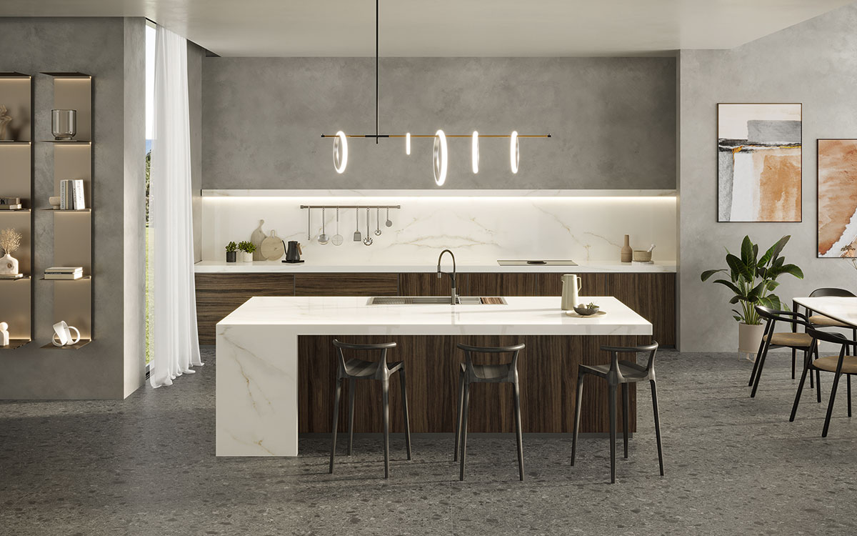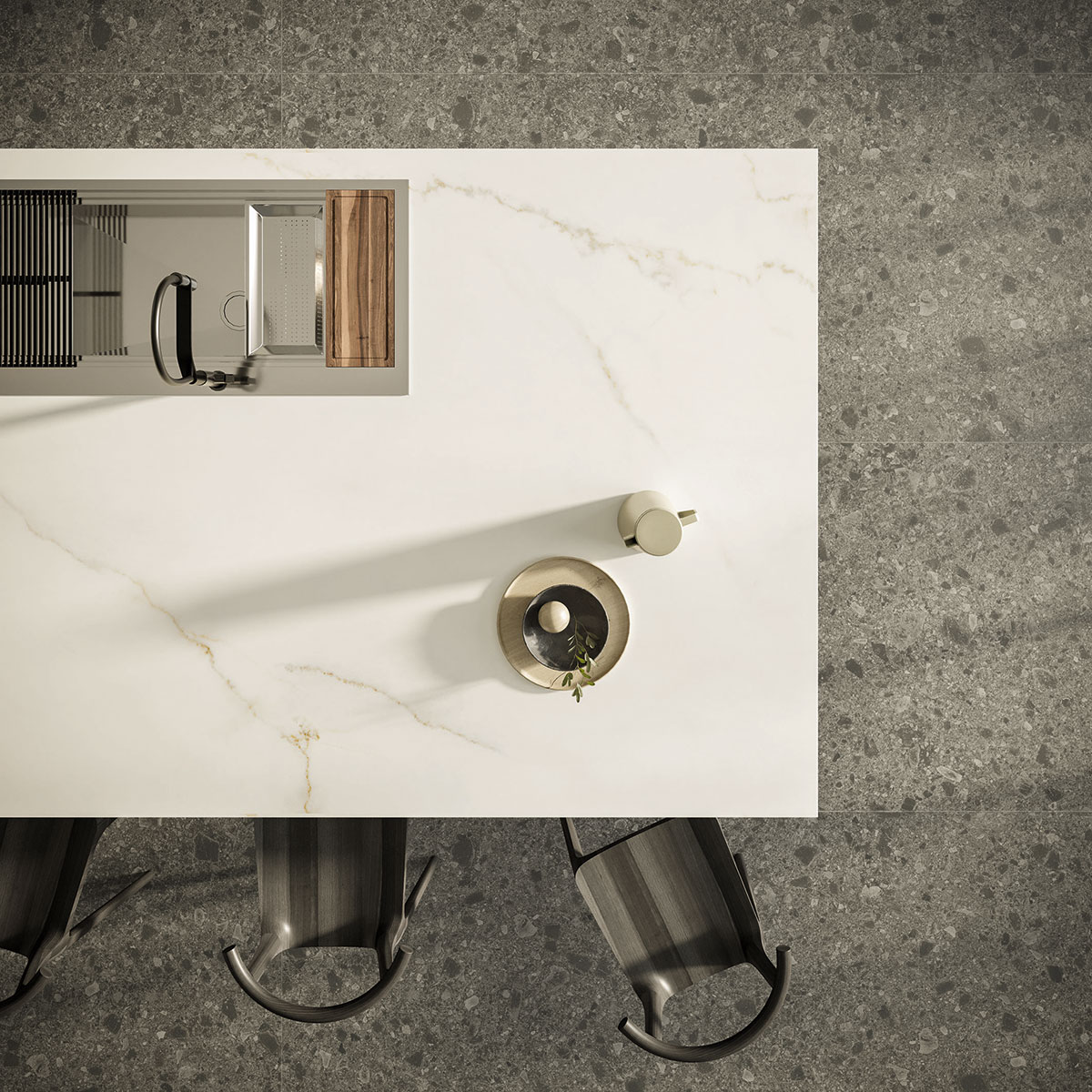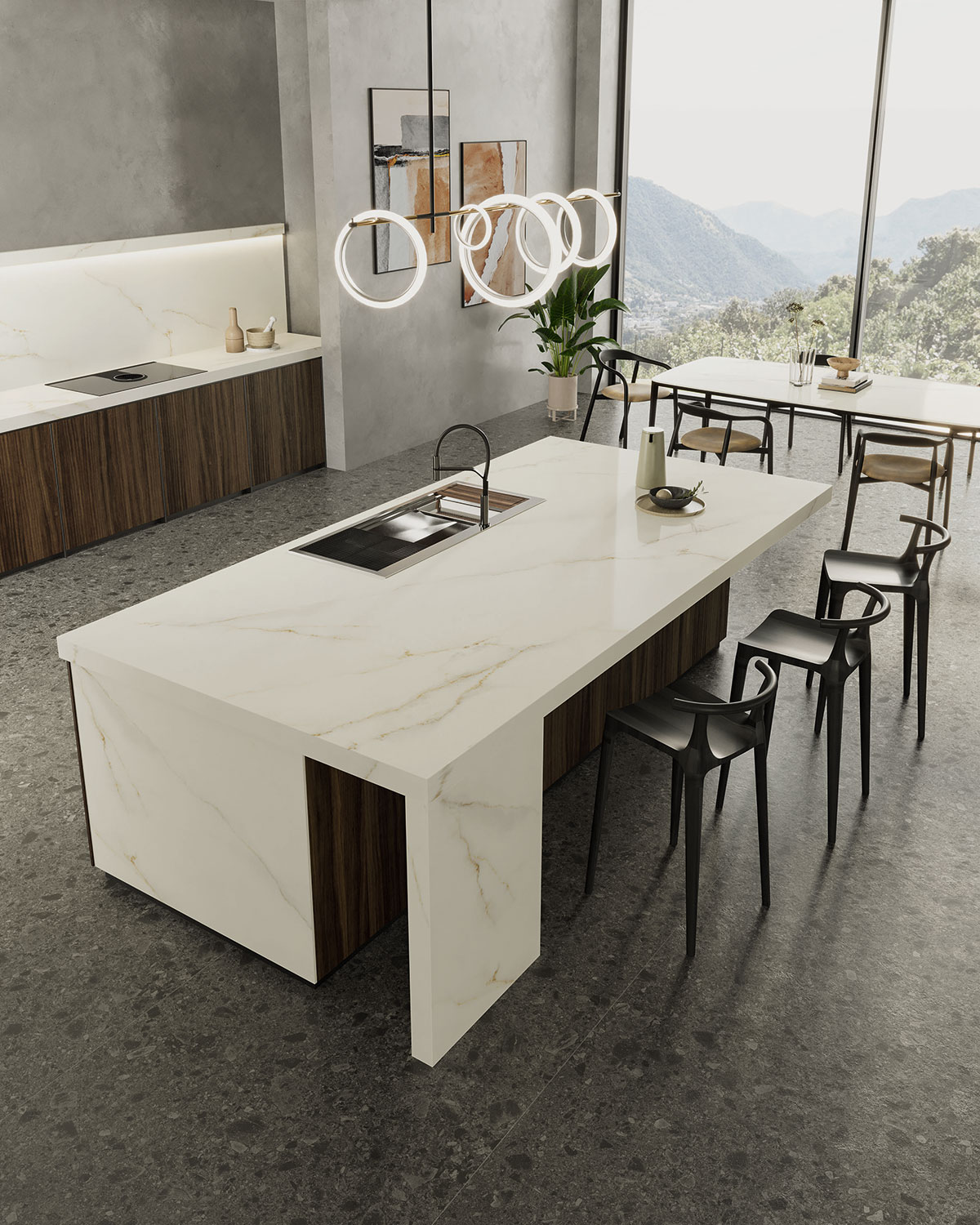 Atlas Plan'ın Calacatta Apuano büyük ebatlı mermer görünümüne sahip porselen plakaları, modern tasarım unsurları ve zıt renkli malzemelerle birleşerek mekanlara özgün bir atmosfer katar.