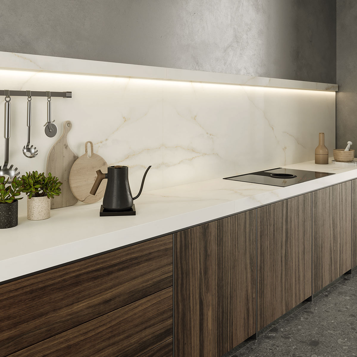 Atlas Plan'ın büyük boyutlu Calacatta Apuano plakası, rafine bir zevke sahip olan konut ve ticari alan projeleri için idealdir.