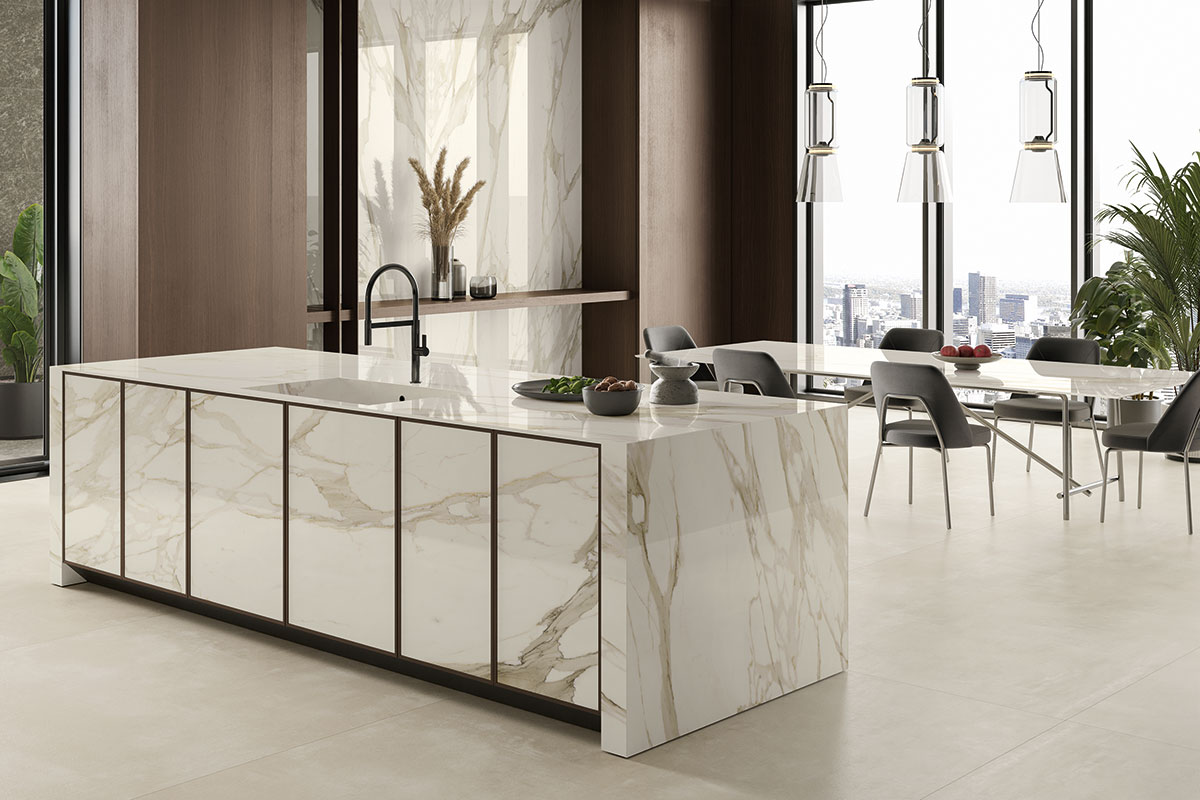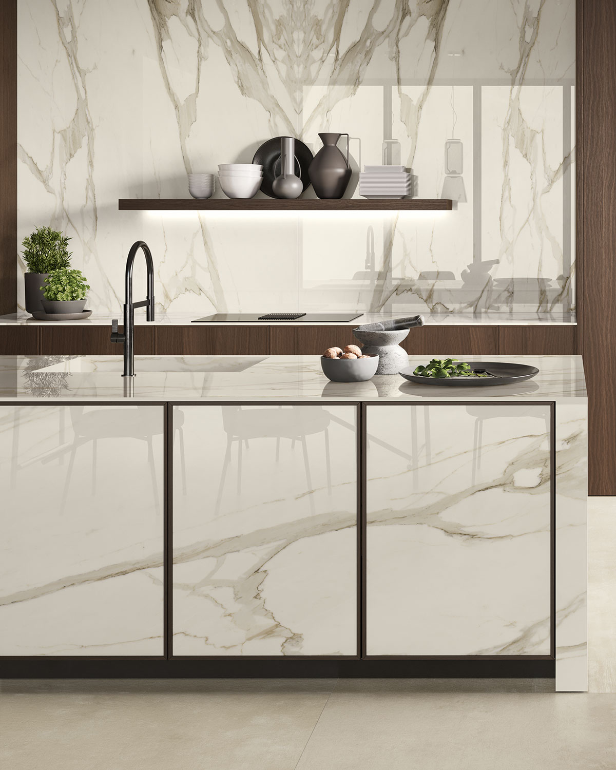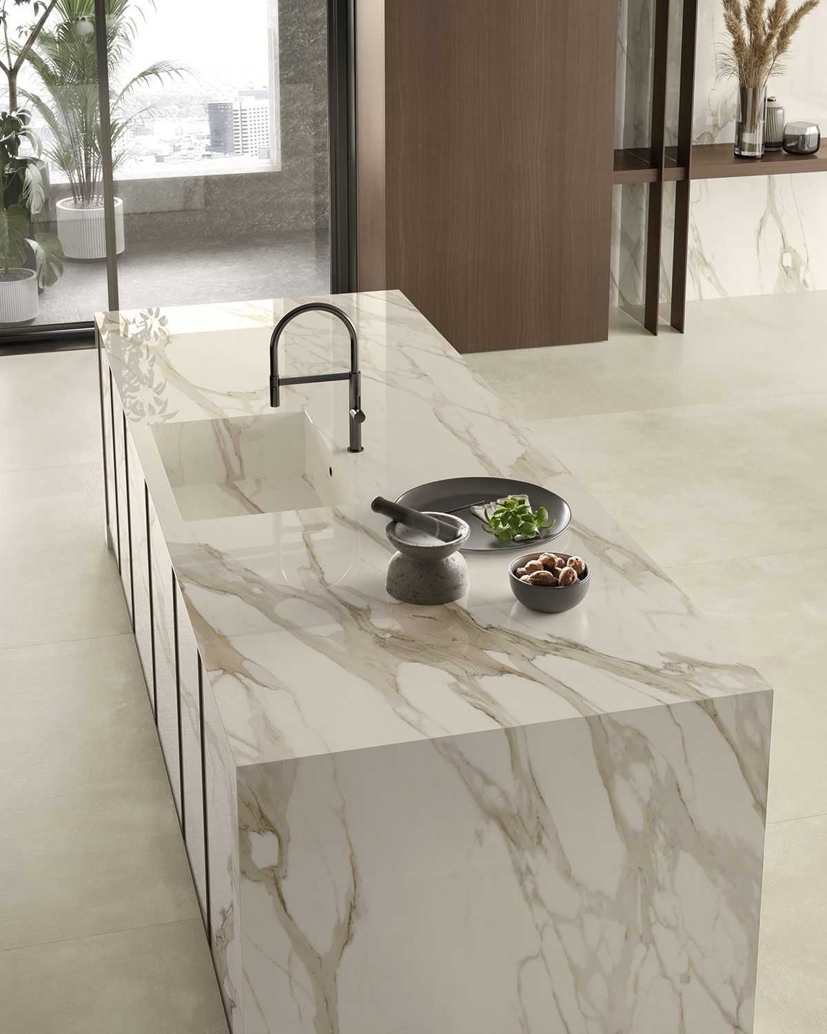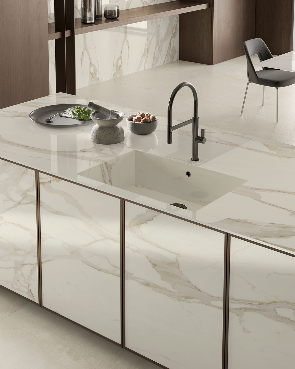 Calacatta Bernini, zarif beyaz mermer görünümlü porselen plakaların doğal zarafeti, uygulandığı projeyi zenginleştirir. Atlas Plan'ın Natura-Vein Tech teknolojisi ile üretilen bu plaka, çok geniş bir kullanım alanına sahiptir ve mutfak tezgahları, lavabo üstleri, tezgah araları ve masalar için idealdir.