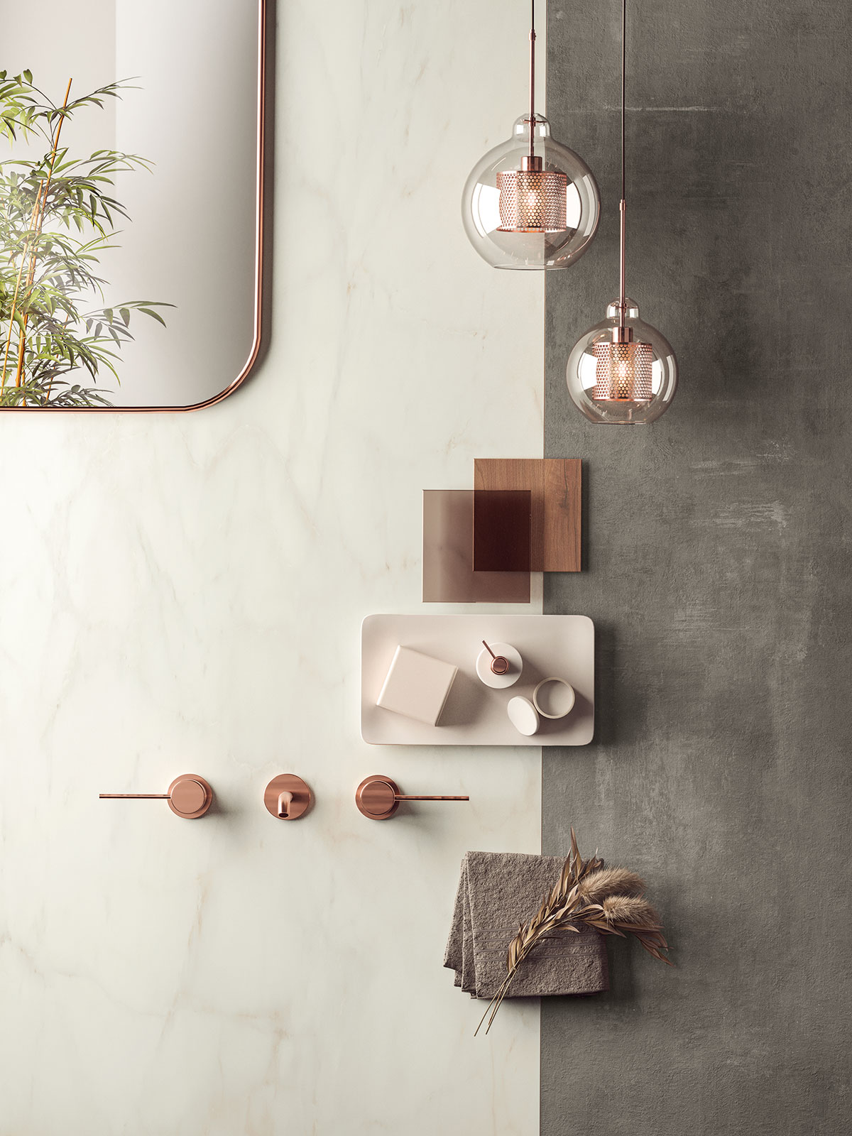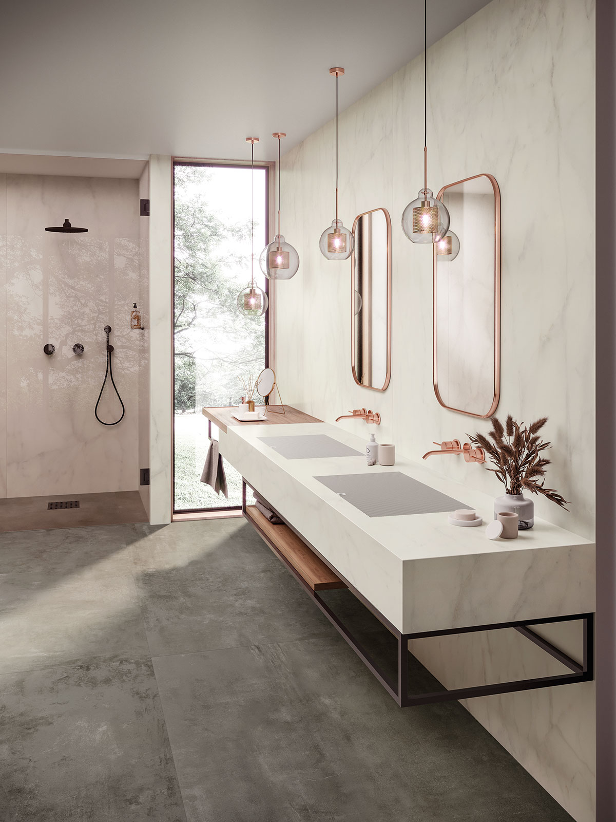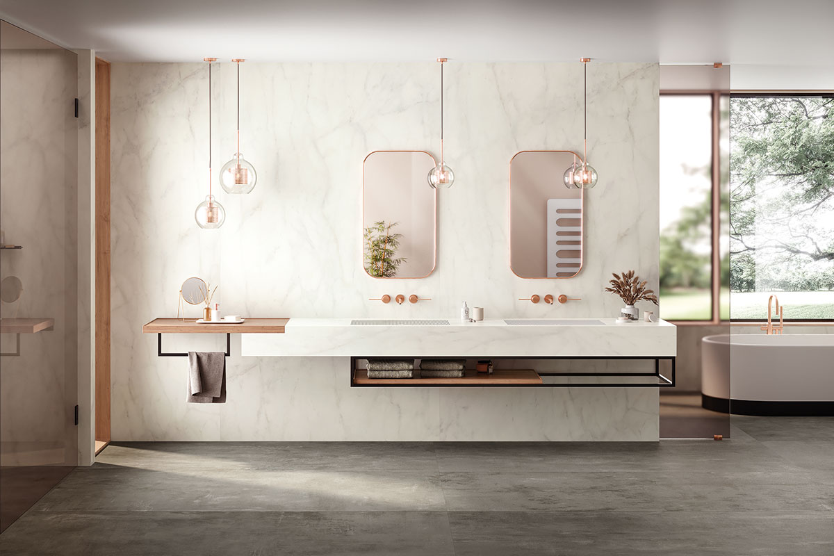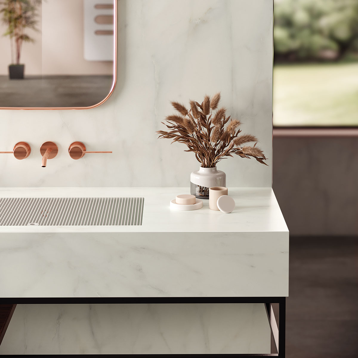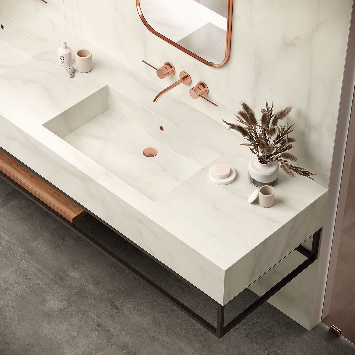 Calacatta Delicato'nun özellikleri, bu büyük ebatlı porselen plakanın çağdaş konut ve ticari tasarım projelerinde uygulanmasına olanak tanır. Mutfak tezgahları, masalar, banyo tezgahları, bar ve restoran tezgahları için ideal bir yüzeydir.