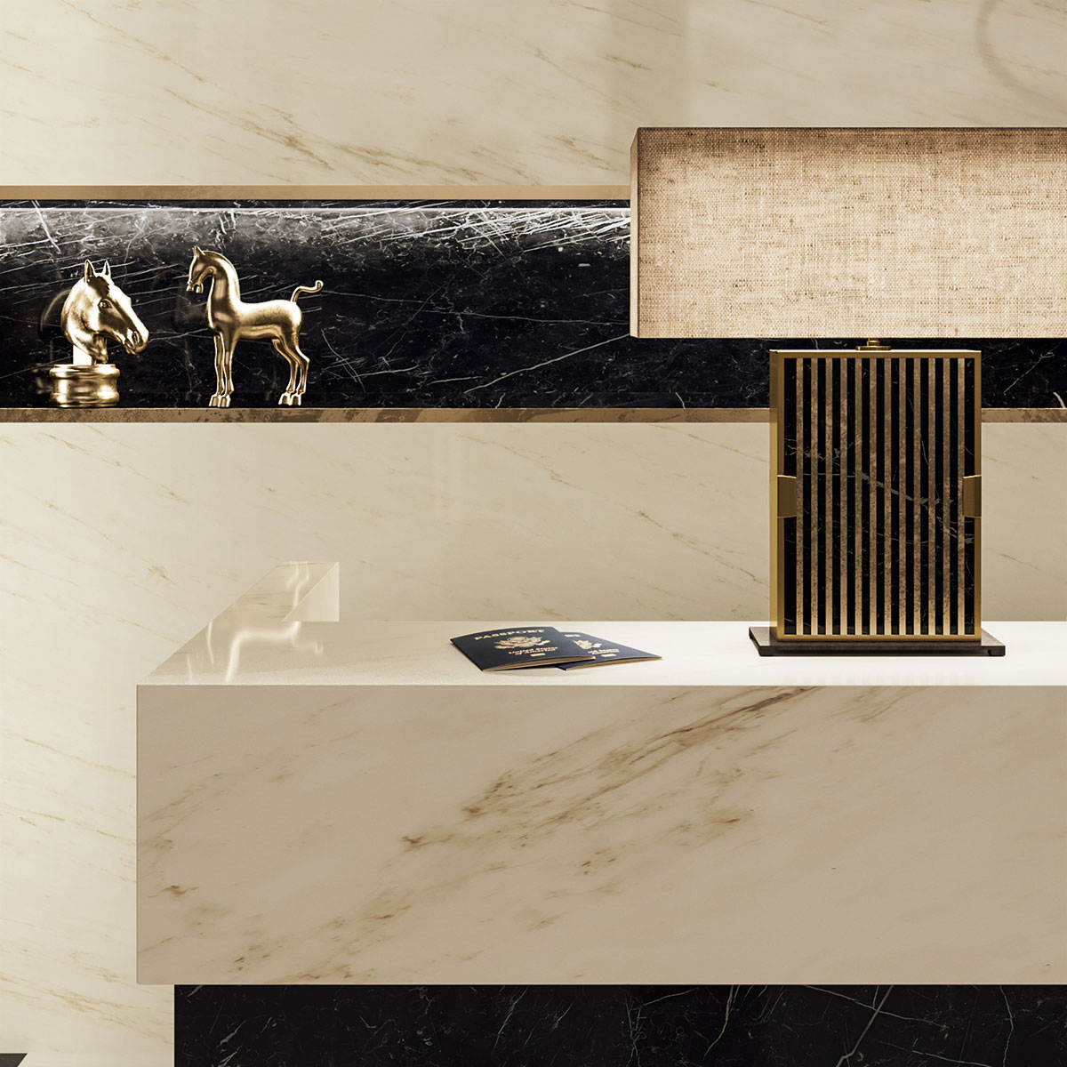 Dekorasyon Fikirleri: Cremo Delicato'nun, Nero Marquina plaka ile dönüşümlü olarak kullanılması, mekanlara lüks ve estetik bir kombinasyon katar.