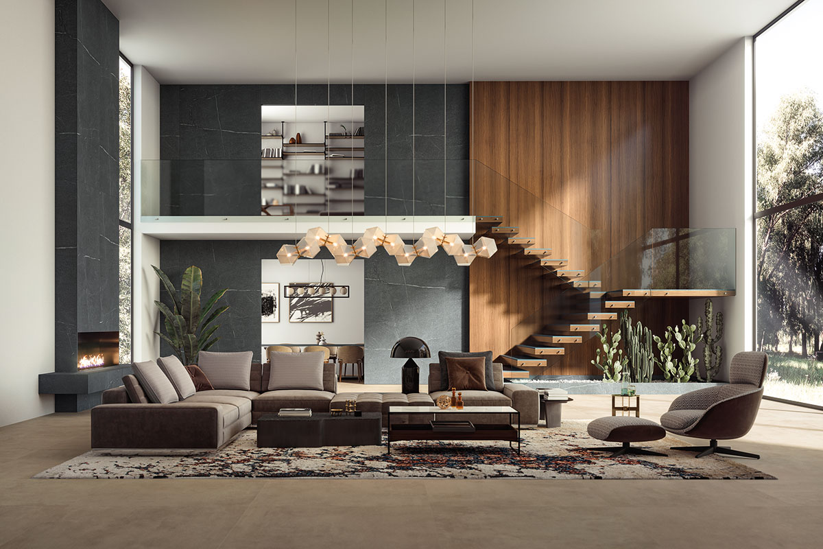 Soapstone Dark, masa, mutfak tezgahı, banyo tezgahı ve lavabo gibi mobilyalar için önerilen bir yüzeydir. Bu gri taş görünümlü porselen plakalar, güçlü karakter ve kişiliğe sahip iç mekan tasarım projeleri için idealdir. Oturma odası ortamlarında çok yönlü bir yüzey kaplama malzemesi olarak kullanılabilir.
