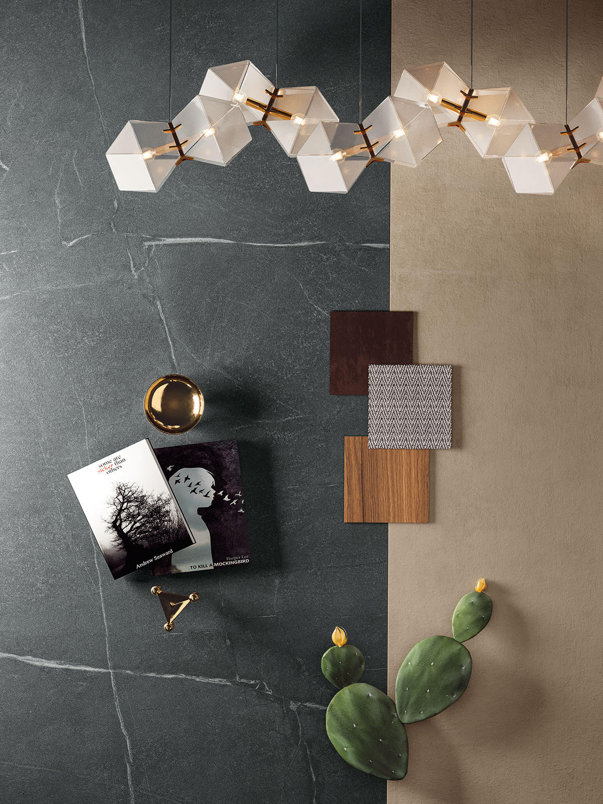 Atlas Plan'ın Soapstone Dark porselen plakaları, metamorfik taşlardan ilham alarak tozlu gri bir arka plan ve derin buz beyazı damarlar ile karakterize edilir. Bu yüzey, duvarlar ve mobilyalar gibi birçok alanda kullanım için idealdir.