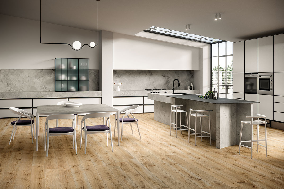 White Cloud, beyaz mermer görünümüne sahip porselen plakalardır ve mutfak tezgahları, lavabo üstleri, tezgah araları ve masalar için idealdir. İnce beyaz damarlarla kesişen çok açık gri bir arka planı vardır. Bu, yüzeylere bulutların dinamik ışık ve gölge görünümünü vererek zarafet kazandırır.